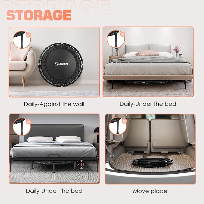 • High-Quality Bungee: BCAN trampoline uses high-quality synthetic bungee, can buffer nearly 85% of the vibrations, provide more sustained and softer elasticity, and protect Knees, Back and Joints, a great choice for health, aerobic exercise, relax
