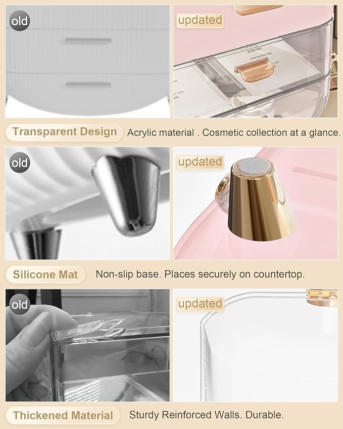 • 【Thickened Material & Non-slip】Reinforced and upgraded handle won't fall off. Easily move the skin care organizer to anywhere. The countertop organizer is made of thickened ABS material, which is stronger and more durable than normal ones. Drawer and clear top are able to open and close easily. Rubberized bottom, non-slip and won't scratch desktop.