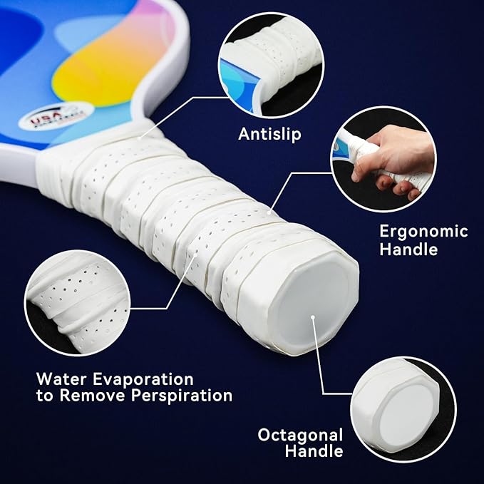 • Comfortable Design: Our pickleball paddles have an ergonomic, non-slip padded grip that reduces vibration and prevents slippage, while the optimized shape of the paddle ensures comfortable handling during long matches.
