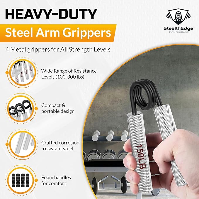 • ๐Ÿ’ช๐Ÿ‹๏ธโ€โ™‚๏ธ๐—ฃ๐—ฟ๐—ฒ๐—บ๐—ถ๐˜‚๐—บ, ๐—›๐—ฒ๐—ฎ๐˜ƒ๐˜†-๐——๐˜‚๐˜๐˜† ๐—ฆ๐—ฒ๐˜: StealthEdge isnโ€™t just about powerโ€”itโ€™s a complete workout system. With five rugged resistance bands up to 175 lbs, four hand grippers ranging up to 300 lbs for unimaginable strength, a high-performance jump rope for intense cardio, a massage roller to recover like a pro, and mini bands for targeted training, this set is built for durability and versatility. Train anywhere, in stealth mode, with the toughest gear in the game.