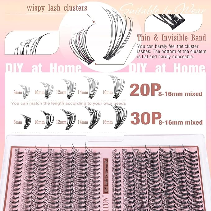 • DIY eyelash extension kit that includes natural-style 20D+30D lash clusters, lash bond and seal, and lash tweezers