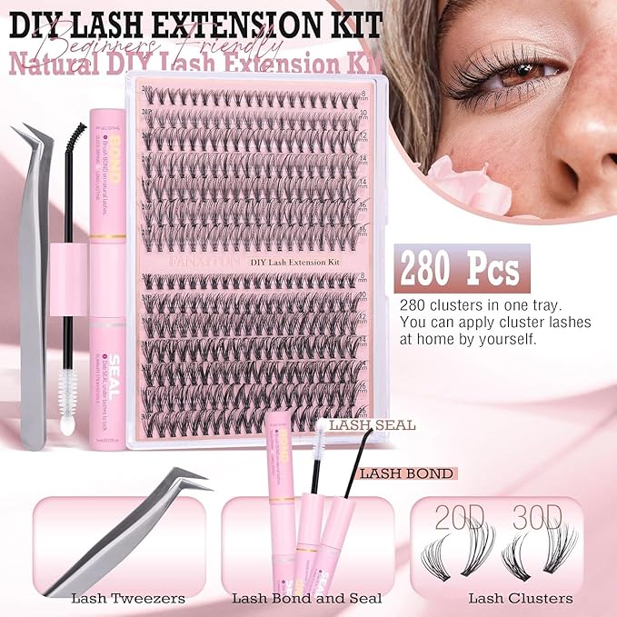 Natural DIY Lash Extension Kit Wispy Lash Clusters D Individual Lashes 20D+30D 280Pcs Lash Clusters Kit 8-16mm Eyelash Extension Kit by FANXITON