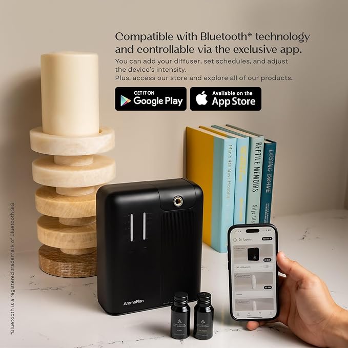 • 2025 NEW RELEASE SCENT DIFFUSER, HVAC CONNECTIVITY & APP CONTROL -The AromaPlan DAP PRO 2025 features a 300ml refillable reservoir and covers up to 2,000 sq ft using cold-air, waterless diffusion technology. Control it effortlessly via the exclusive mobile app, compatible with Bluetooth Technology (Bluetooth is a registered trademark of Bluetooth SIG.), 5 scheduling options, and 10 adjustable fragrance intensity levels. Designed for maximum versatility, it can be wall-mounted, used as a portable floor unit, or integrated directly with your HVAC system for whole-home scent distribution.
