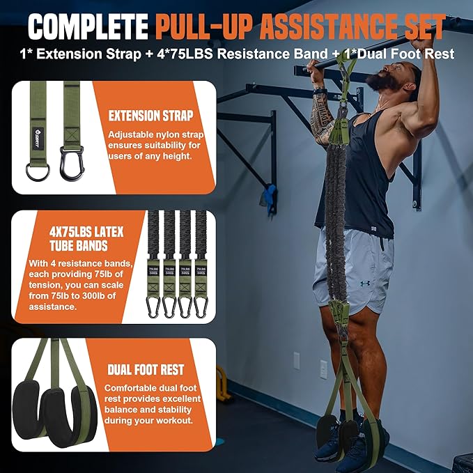 • Personalized Pull-Up Assistance: Struggling with pull-ups? Our pull up bands assistance bands set includes four 75lbs bands, allowing you customize assistance from 75lbs to 300lbs. Start with full support and gradually reduce assistance as you build strength—ideal for beginners aiming for their first pull-up and advanced athletes refining their technique.