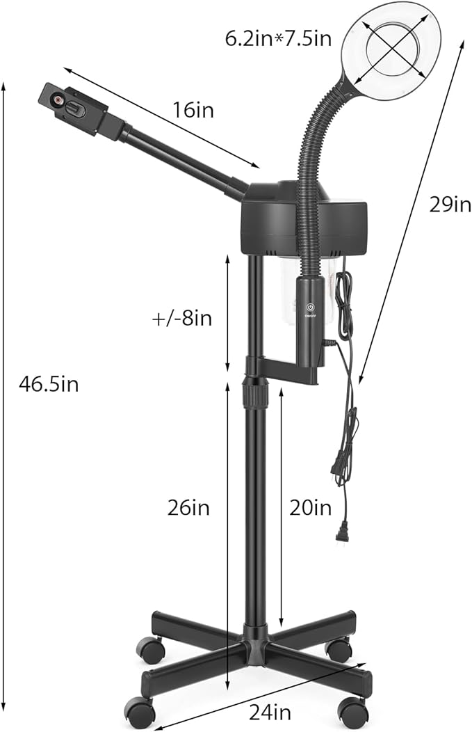 • 【Convenient Design】: Adjustable height and swivel nozzle can be adjusted to any angle you need, the nozzle of the face steamer for facial can be rotated 360 degrees, and 4 low noise wheels can be moved freely anywhere.