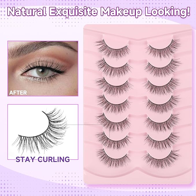 • VEGAN & REUSABLE: 7 pairs false eyelashes pack. The fake eyelashes use ultra-light synthetic fibers, cruelty-free, skin friendly. Bring pretty natural lash extensions look without damaging your own eyelashes, suit for DAY-TO-DAY use, wedding, vacation and so on