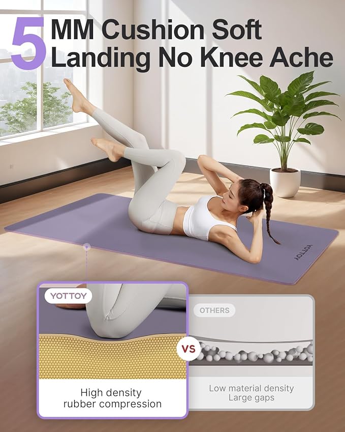 • 1.Innovative Upgraded Yoga Mat: Our YOTTOY PU Yoga Mat features a unique coconut shell material offering superior anti-slip performance. Measuring 72" x 26" x 5mm, it provides enhanced elasticity, durability, and tear resistance, making it the perfect choice for intense yoga sessions. The high-density surface ensures excellent rebound, providing a better grip and stability for your practice.