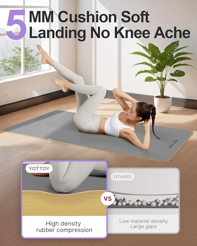 • 1.Innovative Upgraded Yoga Mat: Our YOTTOY PU Yoga Mat features a unique coconut shell material offering superior anti-slip performance. Measuring 72" x 26" x 5mm, it provides enhanced elasticity, durability, and tear resistance, making it the perfect choice for intense yoga sessions. The high-density surface ensures excellent rebound, providing a better grip and stability for your practice.