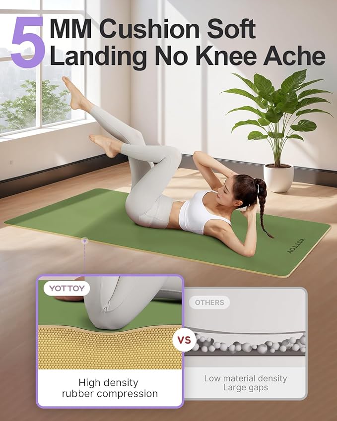 • 1.Innovative Upgraded Yoga Mat: Our YOTTOY PU Yoga Mat features a unique coconut shell material offering superior anti-slip performance. Measuring 72" x 26" x 5mm, it provides enhanced elasticity, durability, and tear resistance, making it the perfect choice for intense yoga sessions. The high-density surface ensures excellent rebound, providing a better grip and stability for your practice.