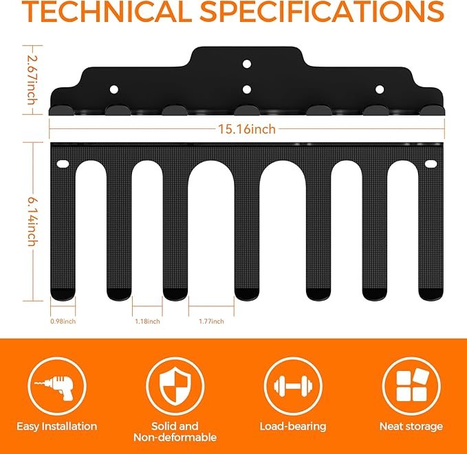 • Sturdy & Durable - The heavy-duty wall-mounted organizer is made of high quality steel plate. Then there is a thick, durable, coarse powder coating on the surface. All the fingers/combs are spaced apart to avoid overlapping, thus protecting your equipment and shelves from scratches