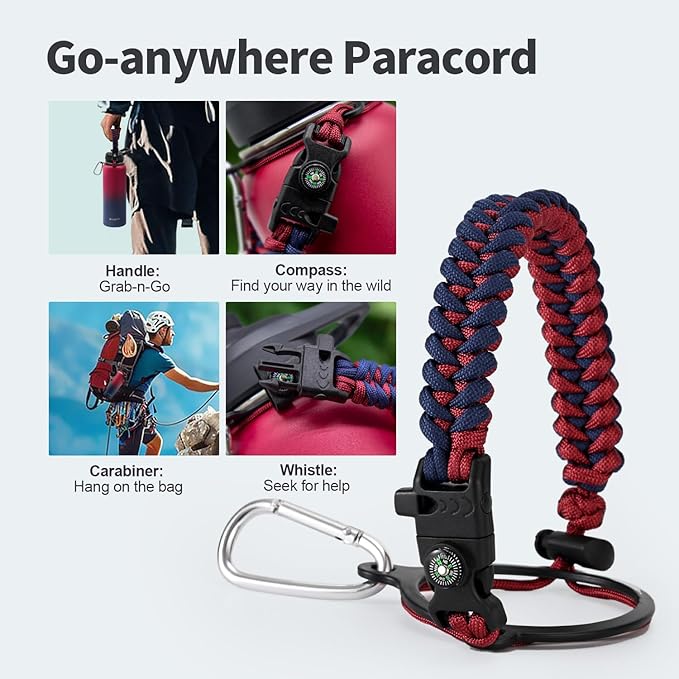 • Palm Fitting Paracord Handle: Compared to handle lids, nylon paracord on the bottle gives you more choices in terms of color coordination and coziness on your hands. Match the handle with your bottle to make a complete outdoorsy look. Compass and carabiner can be lifesavers for hiking and other expeditions