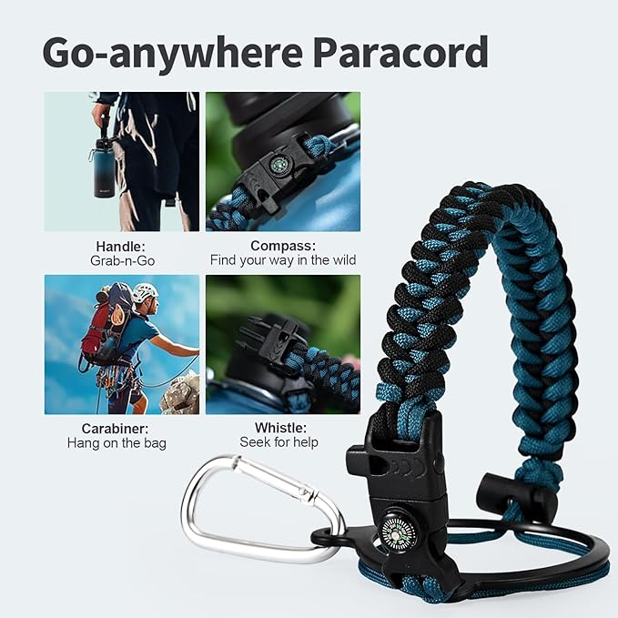 • Palm Fitting Paracord Handle: Compared to handle lids, nylon paracord on the bottle gives you more choices in terms of color coordination and coziness on your hands. Match the handle with your bottle to make a complete outdoorsy look. Compass and carabiner can be lifesavers for hiking and other expeditions