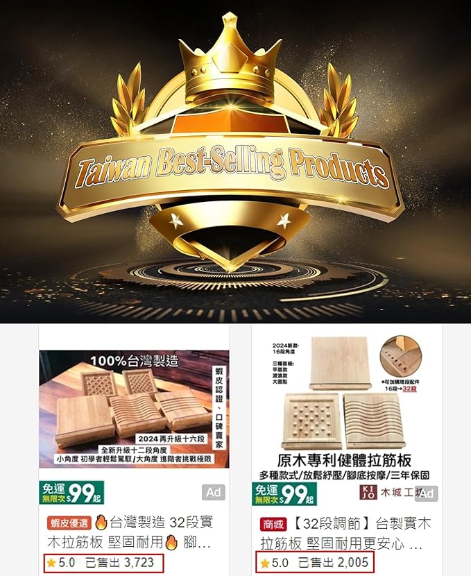 • TAIWAN'S NO. 1 BRAND OF SLANT BOARD - More than 10,000 sets have been sold in Taiwan. Our Wooden Slant Board for calf stretching awarded the top ten commemorative labels in Taichung, Taiwan, and obtained Taiwan patent certificate, certificate number D220706.