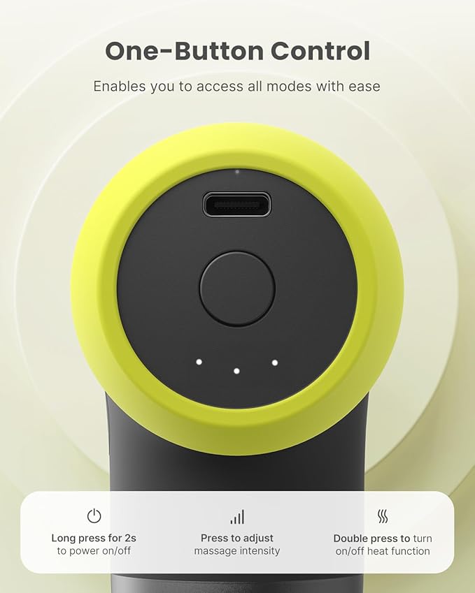 • Effective Heated Massage: Equipped with heat-conductive steel head, the deep tissue massage gun warms up to 46℃/114°F in just 1 minute, effectively reducing muscle tension.Note:Double press the Power button to enable the heating function. The light is red when the heating function is activated. Do not use the silicone massage head when using the heating function.