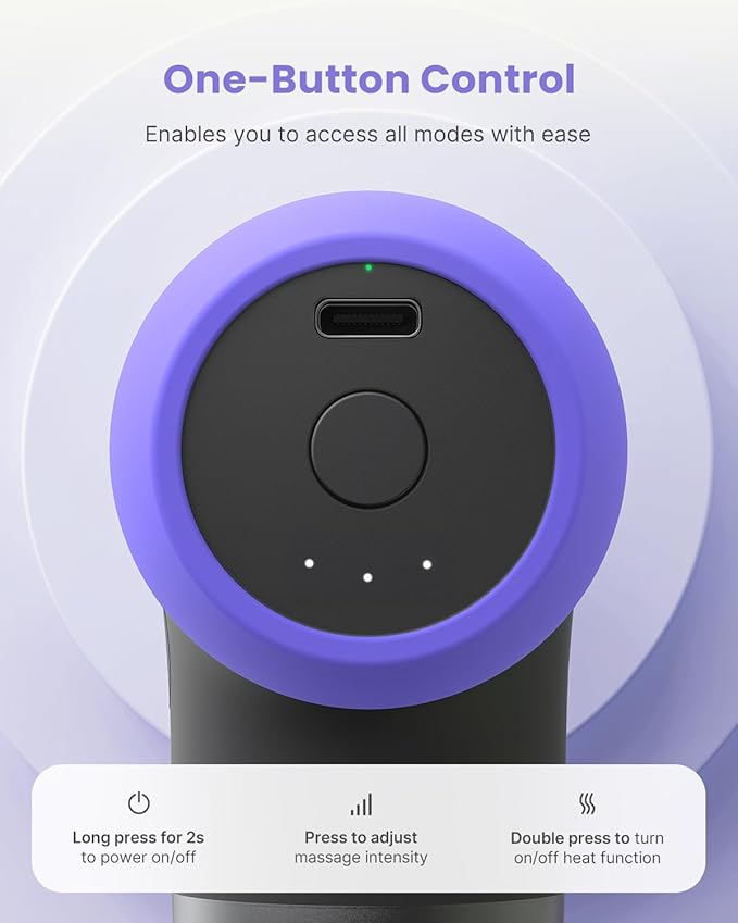• Effective Heated Massage: Equipped with heat-conductive steel head, the deep tissue massage gun warms up to 46℃/114°F in just 1 minute, effectively reducing muscle tension and soreness.Note:Double press the Power button to enable the heating function. The light is red when the heating function is activated. Do not use the silicone massage head when using the heating function.