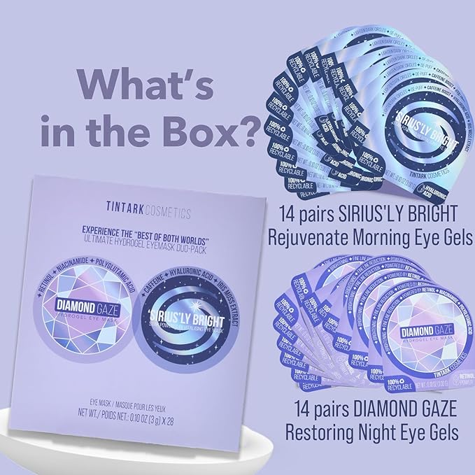 • ULTIMATE HYDROGEL EYEMASK DUO-PACK: Contains 14 pairs of SIRIUS'LY BRIGHT eye masks & 14 pairs of DIAMOND GAZE eye masks. Each pair of eye masks is independent packaging.