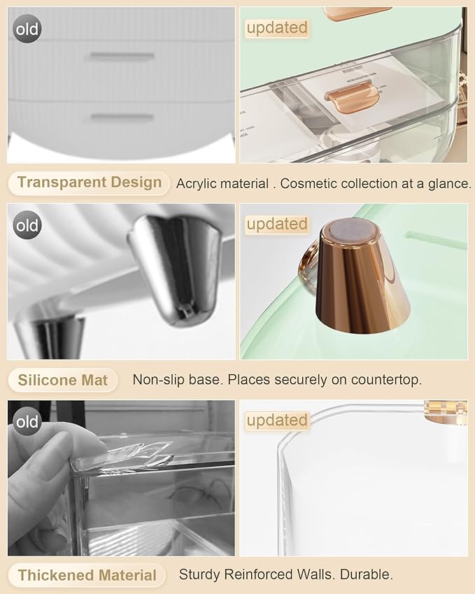 • 【Thickened Material & Non-slip】Reinforced and upgraded handle won't fall off. Easily move the skin care organizer to anywhere. The countertop organizer is made of thickened ABS material, which is stronger and more durable than normal ones. Drawer and clear top are able to open and close easily. Rubberized bottom, non-slip and won't scratch desktop.