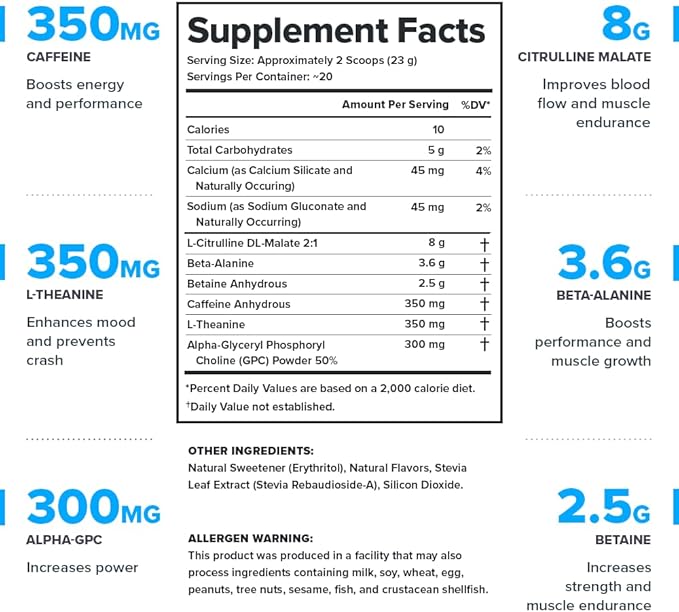• Clean pre workout and transparent label that shows exactly what’s in every serving of our preworkout for men and women and what’s not (no proprietary blends or hidden ingredients).
