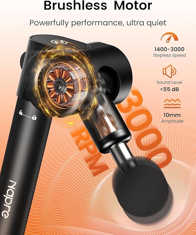 • Up to 3000 rpm(32-speed) & Long Service Time: Stepless speed regulation,32-speeds from 1400 to 3000 rpm controlled by the roller are provided for different muscle groups, aiding in sore muscle massage, relaxing and shaping different muscle parts; it built with a quiet brushless motor,life is almost 50 X longer than brush motor, working noiseas low as 40 dB, which blends in with ambient sound to offer you an enjoyable and quiet massage experience