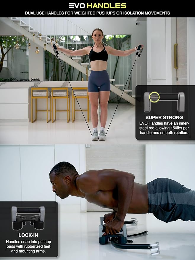• WEIGHTED PUSHUPS - Until now, resistance bands fell short of providing a perfect solution for steady chest development. With our innovative approach, you can combine your EVO Mount, pushup handles, and pushup boards to steadily increase the intensity of your chest workouts without needing an expensive or space-consuming bench press.