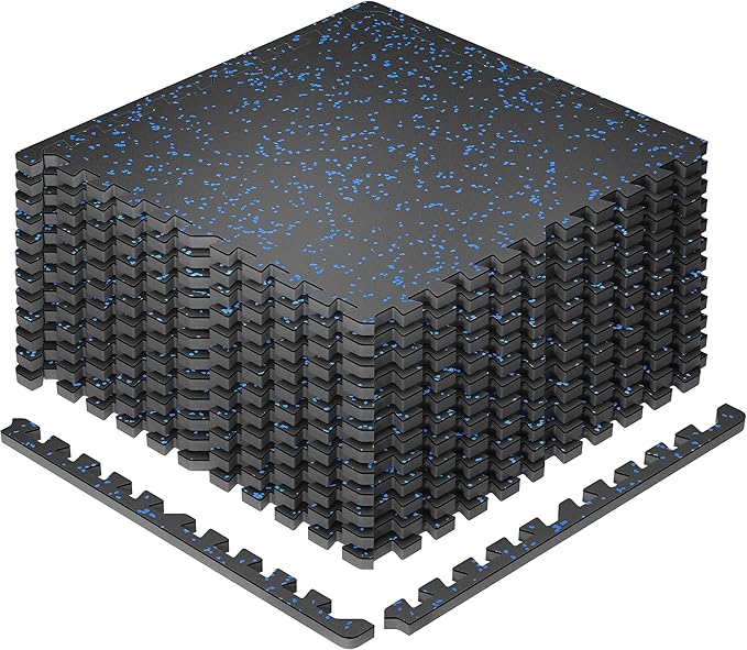 SUPERJARE 0.79'' Extra-Thick Exercise Equipment Mats, 12 Pcs 48 Sq Ft Rubber Top Floor Tiles with High Density EVA Foam, Interlocking Gym Flooring for Home Gym, Workout Mat, Black/Blue