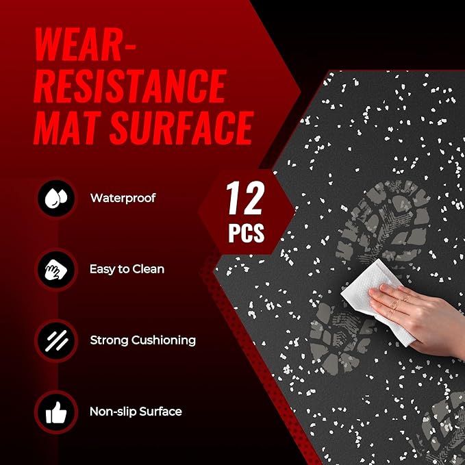 • 【All Places Usable】12 tiles, each with a thickness of 0.79 inch and a size of 24in x 24in, covers 48 Sq Ft. You can place this flooring mat wherever you need it! It's suitable for a garage, gym, family fitness room or playroom.