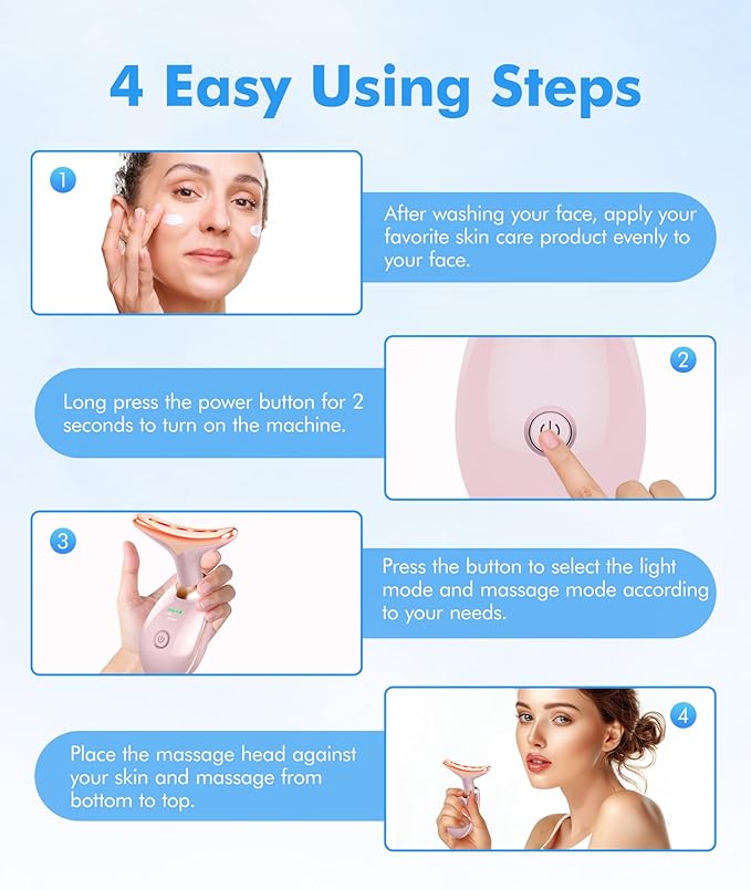 • How to Use: Cleanse the face and apply some skincare products before use. Remove the cap, long press the button to power on and select the mode you need. It is recommended to use it once or twice a day for five to ten minutes each time