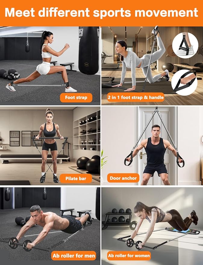 • 【Multi-functional Home Gym】all-round upper-body workouts, A more focused and effective push up training system is color-coded, strengthen and sculpt the upper body. The push-up board combined with resistance bands with bar, Pilates bar, and pulley offers various training positions,you can complete more than 50 different workouts.