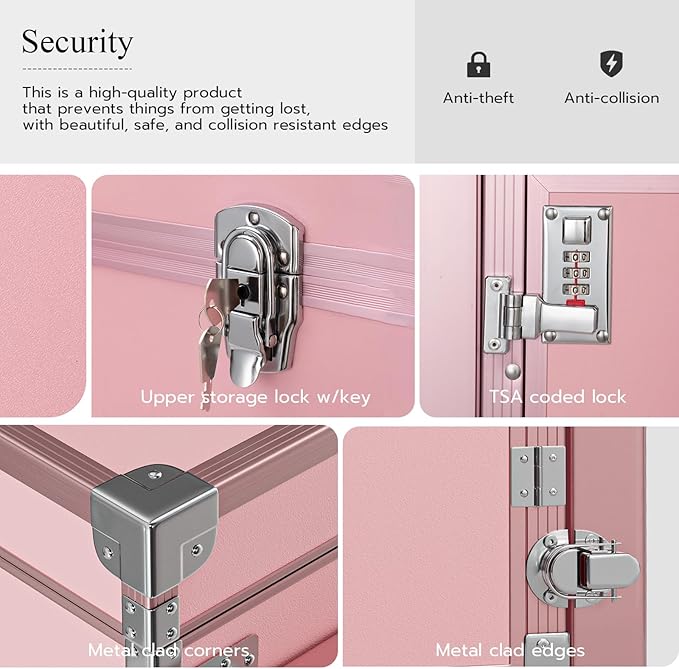 • Security: Storage areas have locks to prevent theft. TSA locks on the drawer also make it easier to customs check. The corners of the case are protected by metal trim to avoid knocks on the move