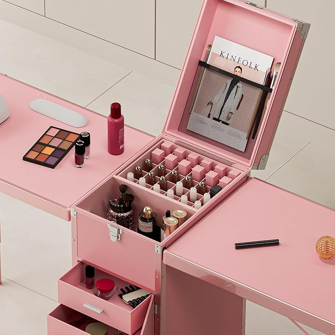 • More Spacious Desktop: The cosmetic case has 2 foldable tabletops on both sides. Provides space for 4 people to get their nails done. You can also place more items on the desktop for easy access