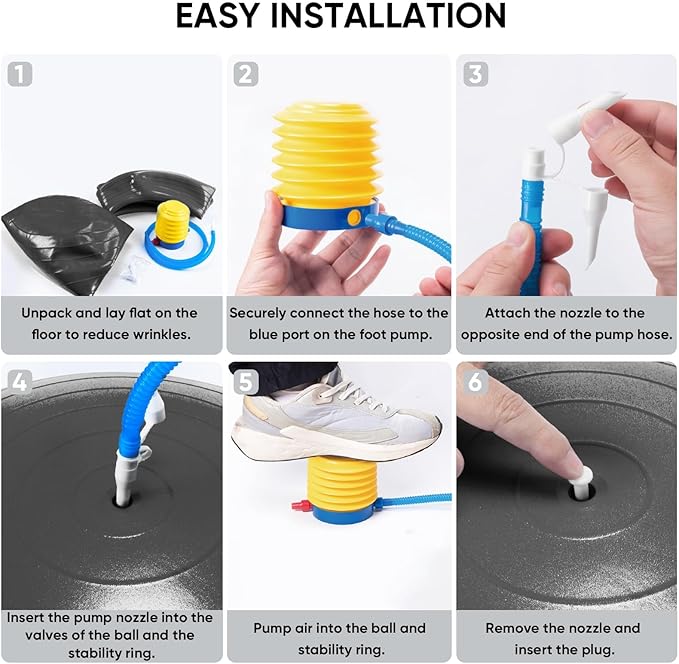 • Easy to Inflate & Portable: This stability ball chair is easy to inflate with the included pump; It's portable and can be easily put into your bag to take anywhere, making it a convenient fitness accessory for home, office, traveling, or gym use; NOTE: Do not overinflate, as it may cause localized bulging