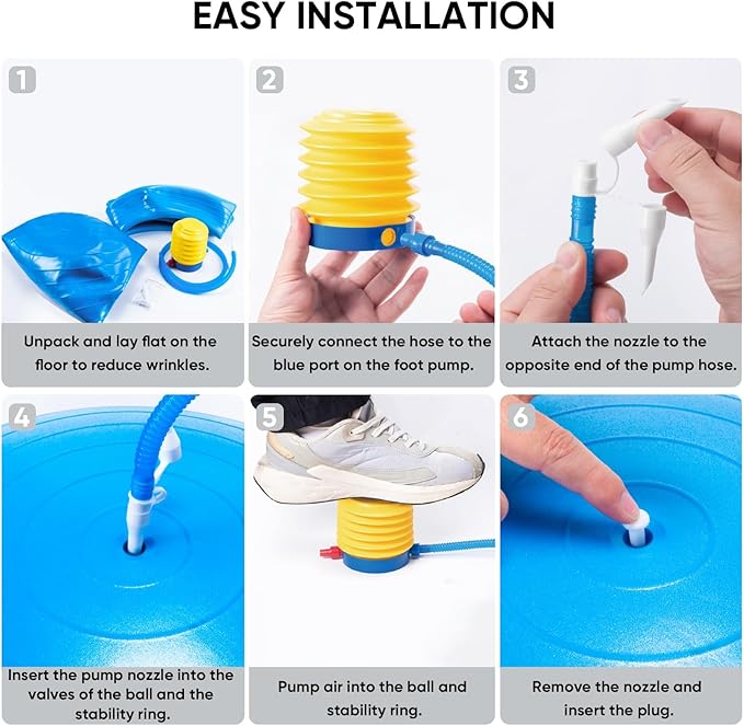 • Easy to Inflate & Portable: This stability ball chair is easy to inflate with the included pump; It's portable and can be easily put into your bag to take anywhere, making it a convenient fitness accessory for home, office, traveling, or gym use; NOTE: Do not overinflate, as it may cause localized bulging