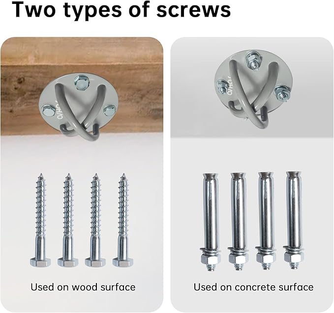 • 【2 Sets of Screws】4 Expansion Screw for Concrete Structures and 4 Self-Tapping Screws for Wooden Structures, can be easily mounted on walls, vertical studs or secure ceiling beams, but not on suspended ceilings.