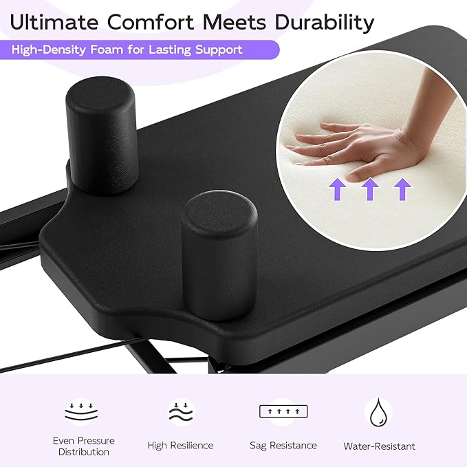 • Comfortable & Sturdy Build - Crafted for both comfort and durability, the reformer’s mat is made with high-density PVC foam, providing firm yet comfortable support. Reinforced iron tubing and anti-slip stabilizers ensure a smooth workout, while PVC silent mats reduce noise and improve stability.