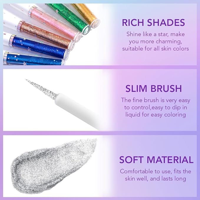 • 【Stunning Sparkle】 This 6-piece set includes vibrant, glitter liquid eyeliners in various metallic colors for creating a captivating, eye-catching look.