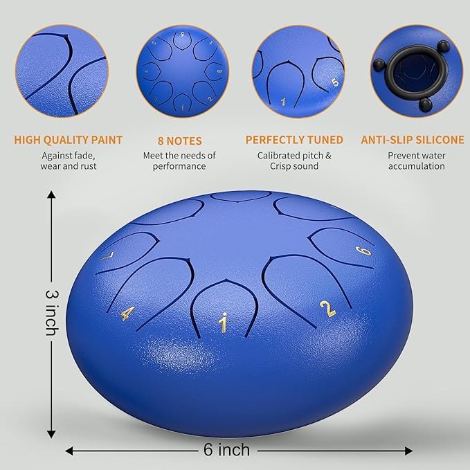 • HIGH-QUALITY CRAFTSMANSHIP: Expertly crafted, this 6-inch chakra drum for rain is made from titanium alloy and coated with paint for exceptional corrosion and rust resistance, and can withstand various weather conditions. Each steel tongue drum is hand-tuned and precisely cut to ensure achieve accurate tones and harmonies.