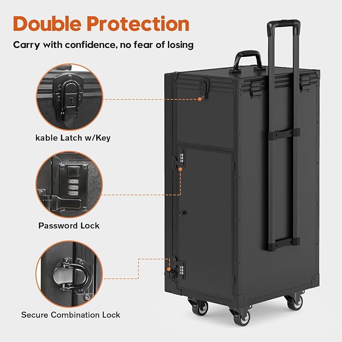 • Safe and Spacious Storage: Features ample storage space with adjustable dividers nail polish tray, large compartments, drawers, and mesh pockets. Each section has its own lock to ensure tools are securely stored and protected from theft