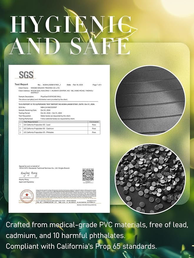• 🤍𝐇𝐲𝐠𝐢𝐞𝐧𝐢𝐜 𝐚𝐧𝐝 𝐒𝐚𝐟𝐞- A gym ball, or also known as fitness ball, physio ball, yoga ball or balance ball is normally made of PVC. We upgraded the grade of PVC of our gym ball to a 16p-free level. It is free from phthalates, latex, BPA and other leading harmful chemicals, thus offering a safe and gentle support for exercise, seat and pregnancy.