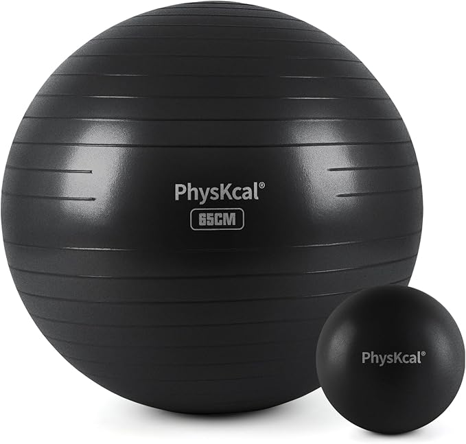 • The PhysKcal Gym Ball with Small Pilates Ball Set is a high-quality, anti-burst fitness accessory that supports up to 300kg/660lbs dynamic load and 2000lbs for static load due to its premium PVC material. Enhanced with an anti-slip frosted finish, this gym ball ensures a secure grip during exercises, promoting balance and stability. Crafted from upgraded 16p-free PVC, this gym ball is free from harmful chemicals like phthalates, latex, and BPA, making it a safe choice for various exercises, seating, and even during pregnancy. The gym ball's versatility is highlighted by its ability to strengthen core muscles, as evidenced by athletes like Lebron James incorporating it into their training routines. Additionally, the unstable nature of the gym ball activates spinal muscles, enhancing torso strength and stability. The product includes essential accessories such as a hand pump, plugs, plug remover, graphic instructions, and a measuring tape to ensure proper inflation and maintenance. Detailed guidance for selecting the appropriate gym ball size for different uses is provided in the package. For any inquiries or assistance, customers can contact the seller directly through Amazon or email support.