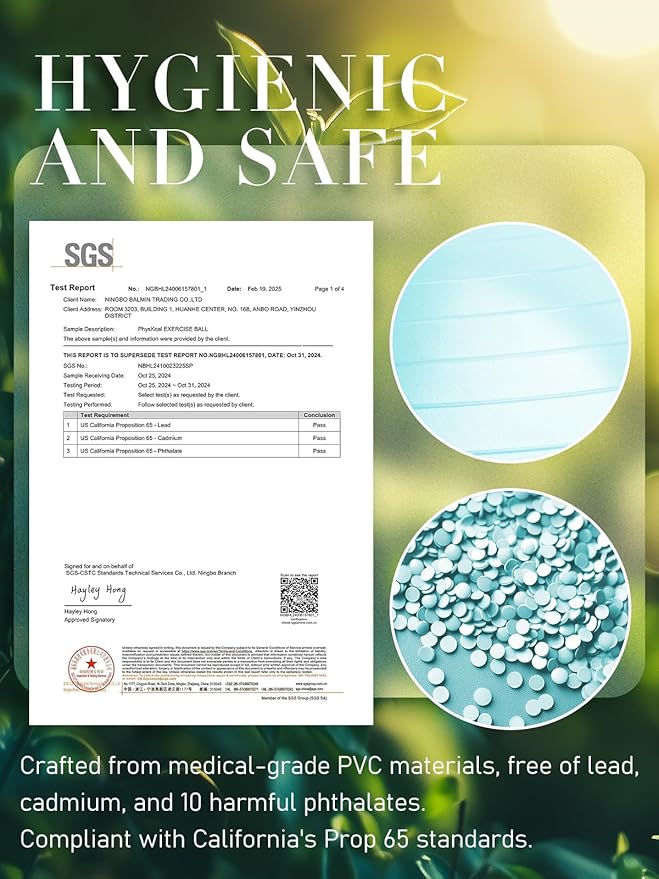• 🤍𝐇𝐲𝐠𝐢𝐞𝐧𝐢𝐜 𝐚𝐧𝐝 𝐒𝐚𝐟𝐞- A gym ball, or also known as fitness ball, physio ball, yoga ball or balance ball is normally made of PVC. We upgraded the grade of PVC of our gym ball to a 16p-free level. It is free from phthalates, latex, BPA and other leading harmful chemicals, thus offering a safe and gentle support for exercise, seat and pregnancy.