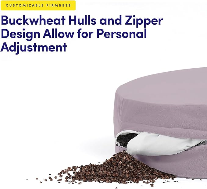• Customizable Round Meditation Pillow with Buckwheat Fill – The round meditation cushion (16” Diameter x 5” Thick) is filled with buckwheat hulls that mold to your body, providing unparalleled support and alignment. Features a zippered inner bag for adjustable firmness to suit your preferences.