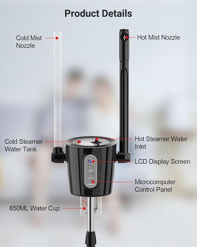 • [Practical & Easy-to-Use Design] The Kingsteam facial steamer features a 360° rotating nozzle, adjustable arm, and height-adjustable mobile stand with a telescopic tube, designed to accommodate your different needs and settings. Whether sitting or lying down, you can easily enjoy spa treatments for your face and neck. The detachable water cup is simple to clean, and we recommend changing the water regularly for optimal performance. The stable, mobile stand with wheels allows for easy movement and secure positioning