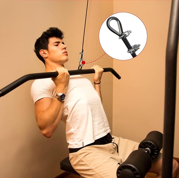 • Cable diameter of 0.2inch/5mm includes the black nylon coating Maximum weight capacity is 500 LBS.Optional length, easy to install. Come with accessories tools, and support to adjustable the size according to your cable machine.