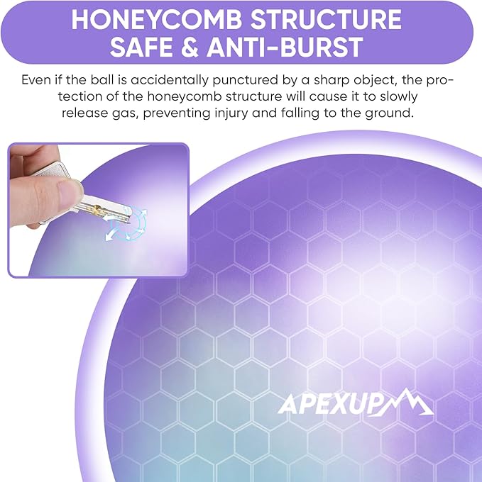 • [SAFE AND ANTI BURST] APEXUP Exercise ball is made of high-quality PVC material, which meets stringent safety standards. It's non-toxic, odorless, and free from harmful heavy metals. With an anti-burst honeycomb structure, it ensures durability and safety during your workouts