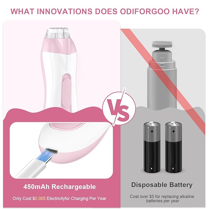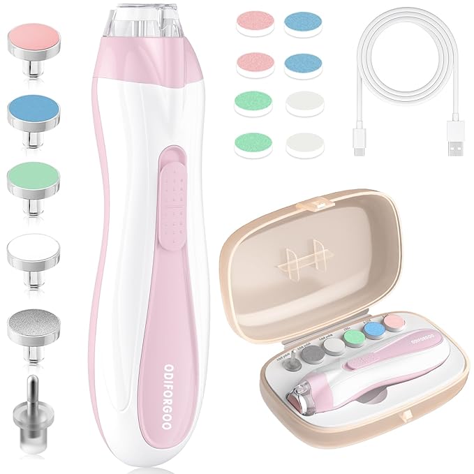 • SAFETY DESIGN:ODIFORGOO uses a special rounded grinding head material, which is soft and has no sharp edges. If you use too much force when grinding, the motor will stop running, effectively avoiding scratching the baby's delicate skin. The grinding head speed has been carefully adjusted to keep it within a safe and gentle range, ensuring that even if it touches the skin around the baby's nails, it will not cause any harm, thus providing all-round safety protection for baby's nail care.