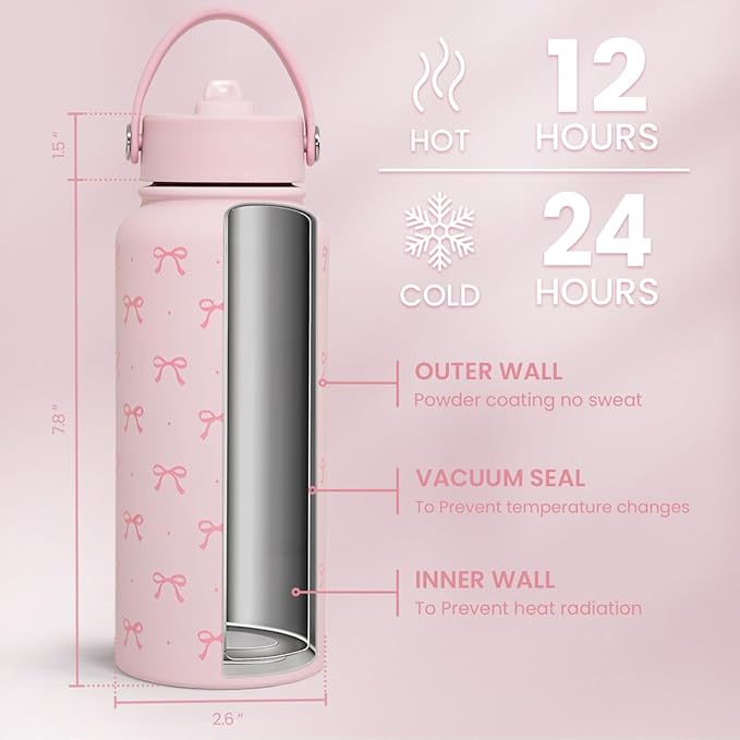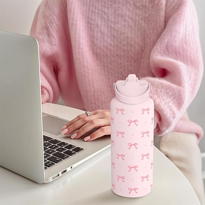 SANDJEST Pink Bow Water Bottle Stainless Steel Insulated Vacuum 32oz with Lid, Gifts for Women Girls Teens Birthday Christmas