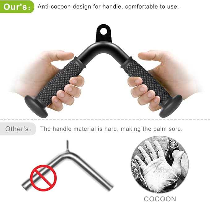 • 【Double D Handle】Double D Handle are designed with non-slip soft rubber grips and high-quality aluminum bars for strength. Perfect for working out triceps, biceps, back, shoulders, chest, and abs, allowing for a variety of exercises like seated rowing and landmine exercises