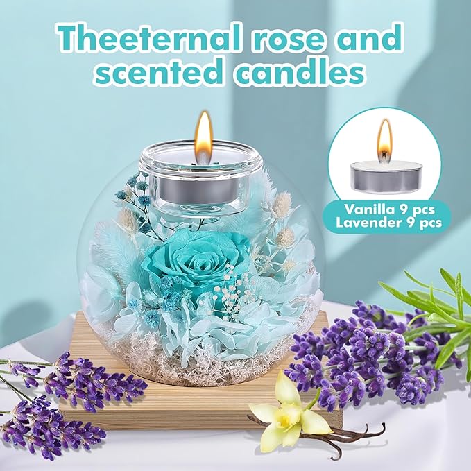 • 【Anniversary Gifts】Great anniversary gifts for women, sending the best wishes to the women around you. What you get: 1 Preserved Eternal Rose + 18 Scented (Lavender x9; Vanilla x9) + 1 Gift Bag + 1 Wooden Base + 1 Greeting Card