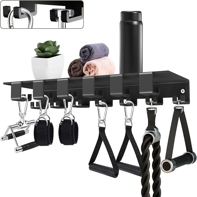 • Super strong storage capacity: The large and elongated flat surface can not only accommodate common sports equipment but also hold related items you use during workouts, such as towels and water bottles. You can even place a small potted plant to decorate your workout space. The seven hooks underneath the flat surface can be used to hang T-shaped brackets and other accessories, as well as commonly used fitness equipment like resistance bands.