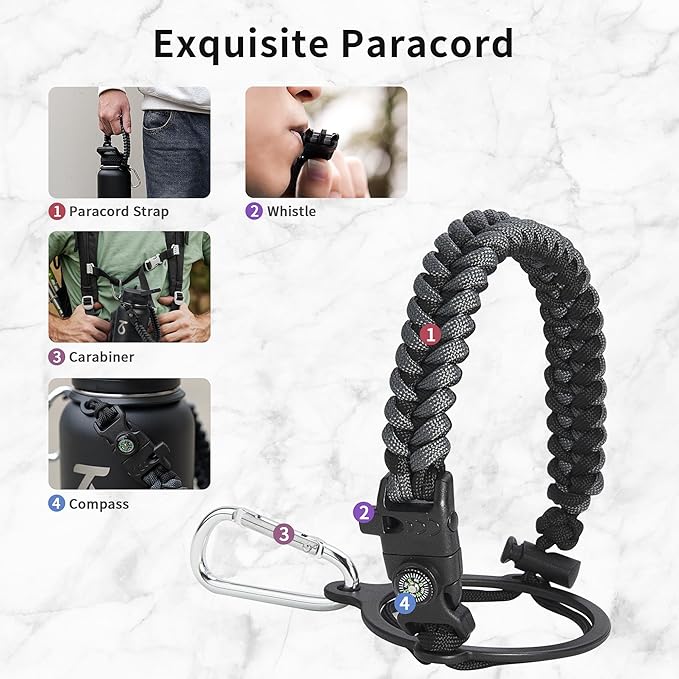 • Full-function Paracord Handle: 32 ounce water bottle come with paracord handle the brilliant paracord of matching colors bring out the bottle with a touch of youthful vibe. Compact compass and handy carabiner make the bottle the ideal survival kit for expeditions in the wild.
